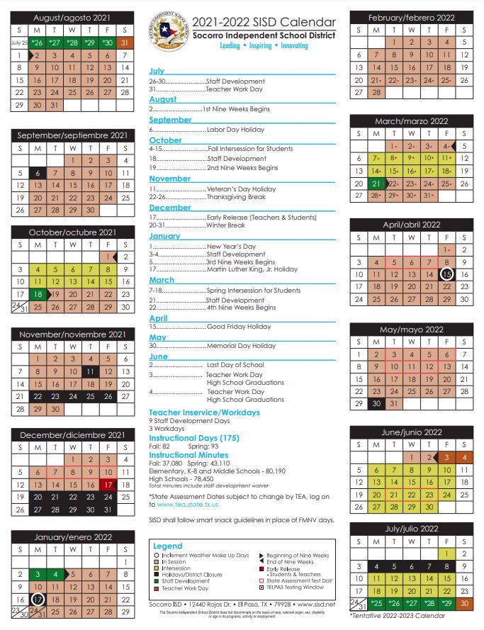 The 2021-2022 school calendar meets all state-mandated requirements for number of required minutes of instruction and staff work schedules. Hisd Is Currently Pre Enrolling. School Calendars 2022 2023 Free Printable Word Templates. SISD Dates to ch ange by TEA of FMNV of Nine Student S rote TELPAS Legend O Up Days a Januaryenera 2021 20 21 27 202-2022 ca 22 sec TX Socorro Independent School District Leading Inspiring Innovating The right choice for ENDLESS OPPORTUNITIES.