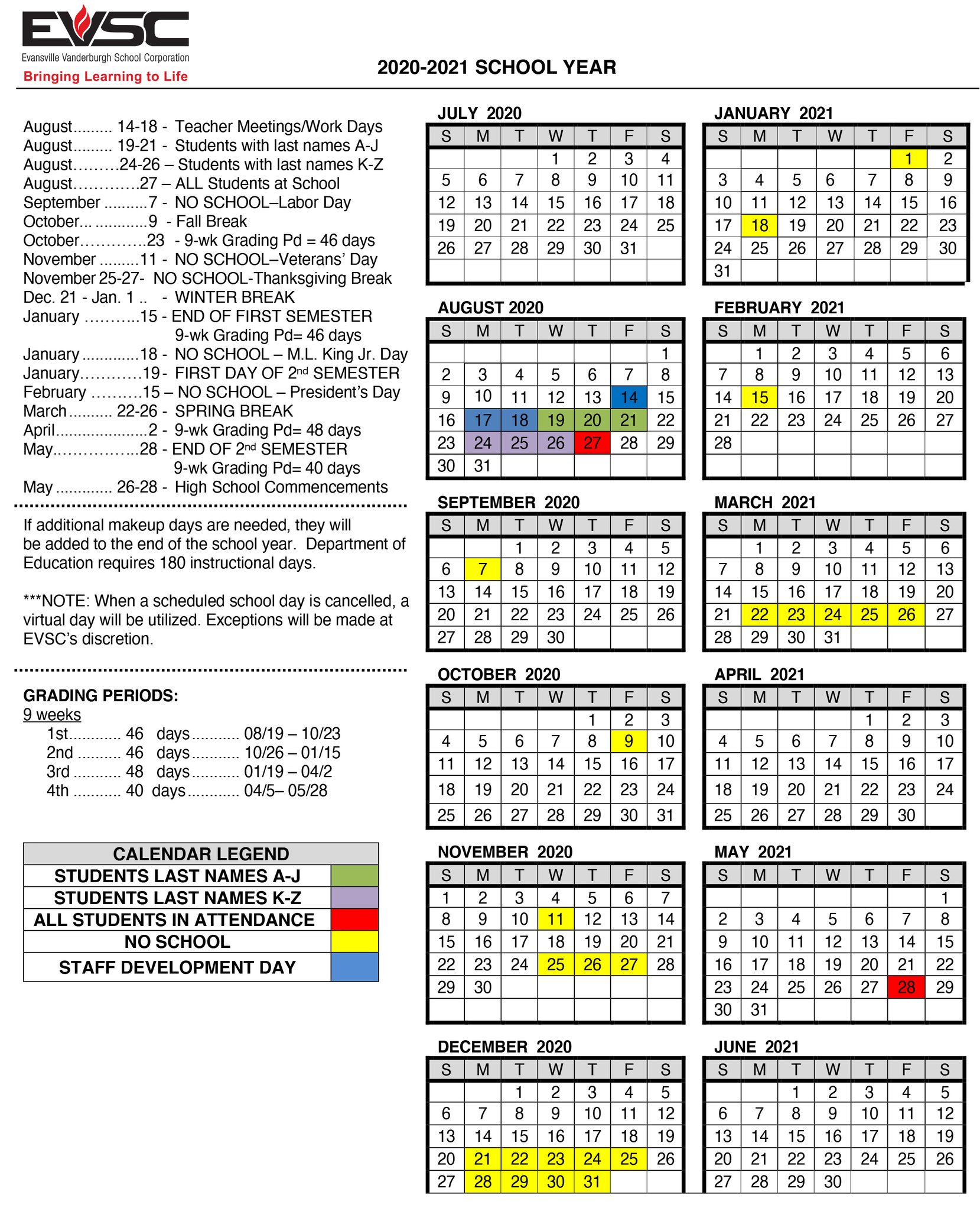 The regular school calendar only applies to traditional K-12 schools. EVSC 100 and 50 units of credit in the environmental science program. Students with the last names A-J will attend school on Monday August 9 and Tuesday August 10. EVSC approves 2021-22 school calendar.